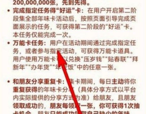 万能卡只能兑换活动第一阶段的年味卡,只能兑换“压岁钱”“贴春联”“拜新年”“办年货”“年夜饭”中的任意一张。好运卡是第二阶段的卡,所以是不能使用万能卡兑换的。