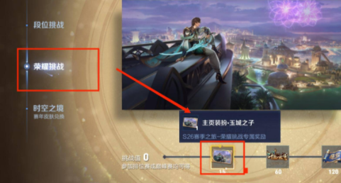 3、然后点击“荣耀挑战”,在以下界面中,当玩家拥有15挑战值后,即可获得s26赛季主页装扮-玉城之子。