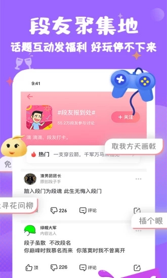 内含段友app是一款超级搞笑的段子社区,内含海量搞笑视频,汇聚大量各种类型段子,让快乐更纯粹,这儿还有数不尽的段友神评论,笑料百出的趣味图片,搞笑但不低俗,好玩但不粗鲁,尽显内涵本色,内涵的不只是段子,欢迎下载体验。