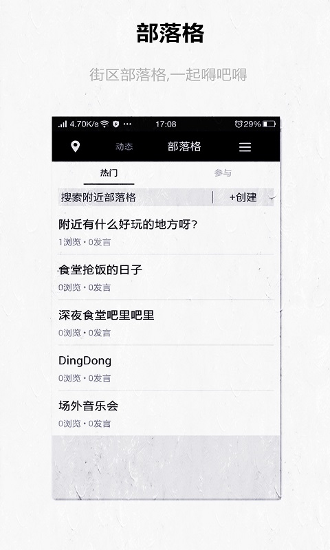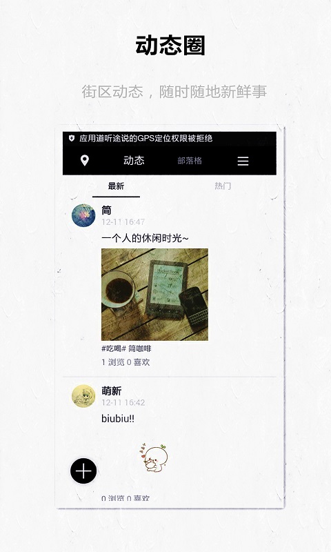 立即下载 大小:10.1M 点击:0次 道听途说 支 持:安卓 分 类:手机软件 大 小:10.1M 版 本:v1.1.88 安卓版 点击量:0次 发 布:2018-05-31 08:44:00 手机扫码免费下载 #道听途说截图 #道听途说简介 道听途说,这是一个街区动态部落格,更多精彩等你发现,快来下载看看吧。一起聊天,发现更多社区精彩,喜欢就来下载吧。 道听途说 发现身边的角角落落 软件功能 【1】街区动态圈,走到哪儿看到哪儿,随时随地发现身边精彩。。 【2】街区部落格,相互侃一侃,一起�N吧�N,。。。 【3】发现外面的世界?寻找街区,轻松切换,发现更多精彩。。。 软件特色 动态圈,街区动态,随时随地新鲜事 部落格,街区部落格,一起�N吧�N 街区切换,发现不同精彩
