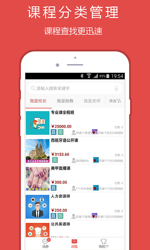 根据校长、助教、老师身份的不同,分类查看自己发布的课程。