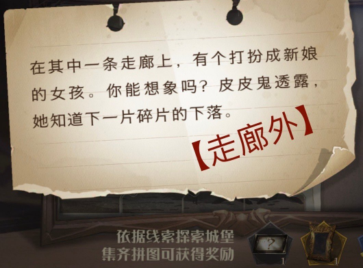 线索二:在其中一条走廊上,有个打扮成新娘的女孩。你能想象吗?皮皮鬼透露,她知道下一片碎片的下落。