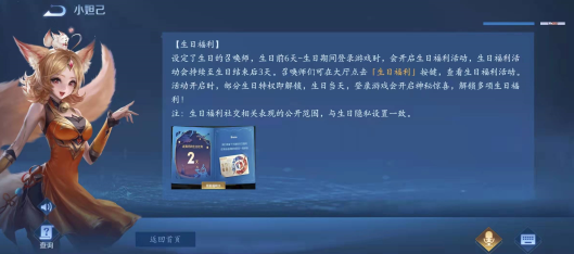 等到你生日的前六天,登录游戏的时候,系统会在主界面弹出一个生日福利界面,打开即可领取生日福利。生日福利活动会持续至生日结束后3天,一共持续10天时间,福利包含积分、铭文和优惠券等等。