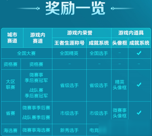 在游戏内和好友组成小队,参与全国大赛海选,只要进入城市大区联赛、获得微赛事-季后赛冠军或战队赛-季后赛冠军,即可获得【省级选手】王者生涯称号和【省级选手】的王者成就,以及联赛精英头像框
