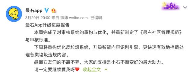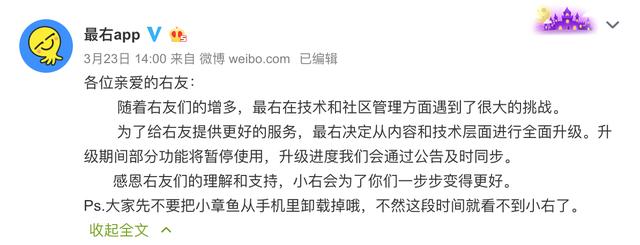 3月23日,最右App官方微博发布声明称,“为了给右友提供更好的服务,最右决定从内容和技术层面进行全面升级。升级期间部分功能将暂停使用,升级进度我们会通过公告及时同步。”