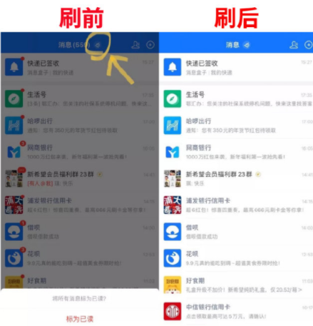 支付宝App近日悄悄上线了一个“消息刷子”功能,让用户在消息界面能一键将所有信息标记为已读,彻底清除掉消息提醒数字,解决了很多App都存在的消息打扰问题,缓解了不少用户的红点焦虑。